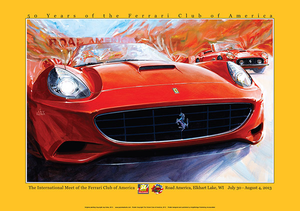 50th anniversary of the Ferrari Club of America. The event was in late July in Elkhart Lake, Wisconsin. Host hotel was the Osthof Inn and track events were at nearby Road America. This art features a 2013 and 1963 Ferrari California.