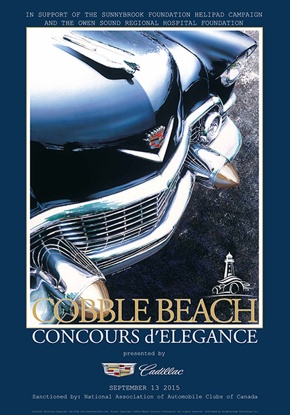 Two versions of the 2015 Cobble Beach Concours poster were designed. The first incorporating this new 34x44" acylic on canvas original featuring a Series One Jaguar E-type in front of the Cobble Beach Club House. Last minute participation by Cadillac as presenting sponsor saw the poster redesigned